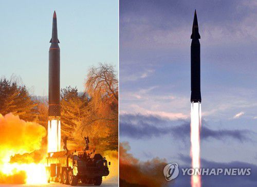 (평양 조선중앙통신=연합뉴스) 북한이 전날 극초음속 미사일을 시험 발사했다고 조선중앙통신이 6일 보도했다. 앞서 북한은 지난해 9월 28일 새로 개발한 극초음속 미사일 화성-8형 시험발사를 처음으로 진행했다고 밝힌 바 있다. 사진은 전날 발사한 극초음속 미사일(왼쪽)과 작년에 발사한 화성-8형(오른쪽)으로, 탄두부 모양이 다소 다른 모습이다.[연합뉴스 자료사진] 2022.1.6