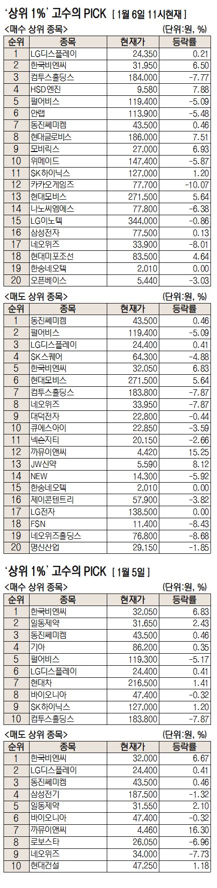 이날 미래에셋엠클럽에 따르면 미래에셋증권 주식 거래 고객 중 최근 1개월간 투자 수익률 상위 1%에 해당하는 ‘주식 초고수’들이 6일 오전 11시까지 가장 많이 사들인 종목은 LG디스플레이였다.