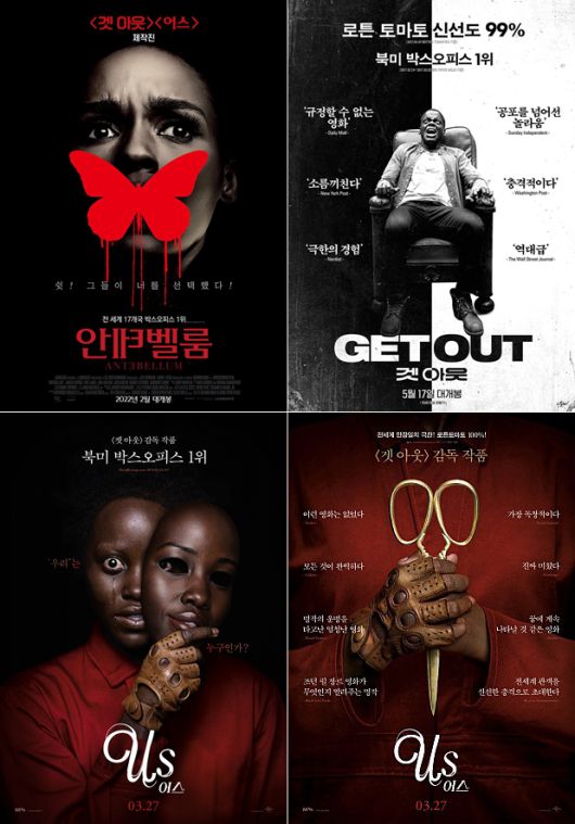 '겟 아웃' '어스' 제작진이 선보이는 신작 '안티벨룸'은 이미 전 세계 17개국 박스오피스 1위를 기록하며 주목받고 있다. 특히 공개된 포슽 또한 '겟 아웃' '어스' 포스터와 평행이론이 일 정도로 유사점이 분명하다. 3편 모두 흑인 배우들이 두려운 표정으로 등장한다. 또 '겟 아웃'의 소파, '어스'의 금색 가위와 가면에 이어 '안테벨룸'에서는 나비가 상징의 의미로 사용될 것으로 예측된다.