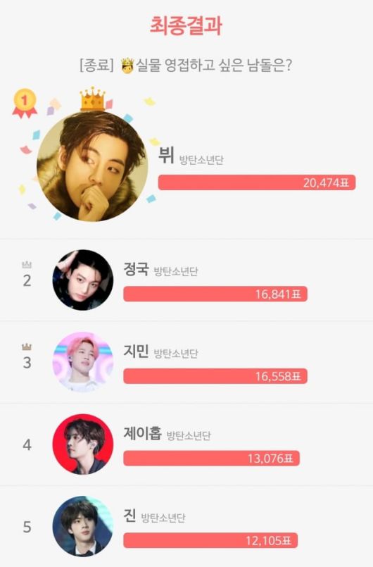 그 결과 뷔는 총 3만 9천 182표 중 2만 474표를 얻어 압도적인 1위에 올랐다.
