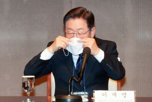 (서울=뉴스1) 국회사진취재단 = 이재명 더불어민주당 대선후보가 6일 서울 중구 프레스센터에서 열린 한국행정학회 주최 대통령선거 후보자 초청 토론회에 참석해 발언을 마치고 마스크를 쓰고 있다. 2022.1.6/뉴스1 |