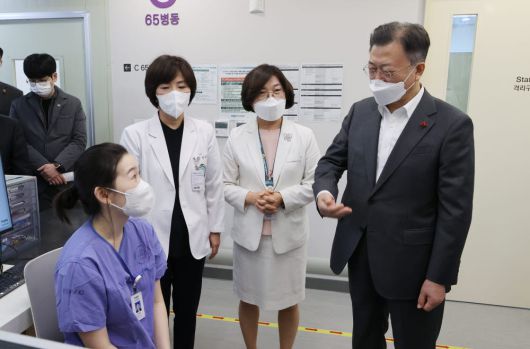 문재인 대통령이 24일 서울 강서구 마곡동 이화여자대학교 의과대학 부속 서울병원을 방문, 의료진과 대화하고 있다. 연합뉴스 |