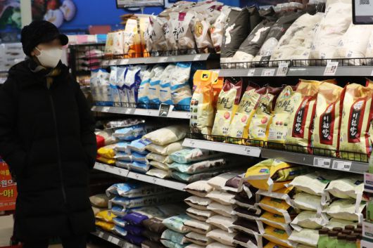 서울시내 한 마트에서 마스크를 쓴 시민이 쌀 판매대 앞을 지나고 있다. 연합뉴스 |