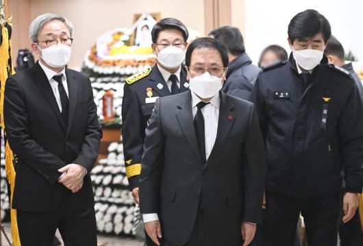 유영민 대통령비서실장이 7일 오전 경기도 평택시 제일장례식장에 마련된 평택 신축 공사장 화재 현장에서 순직한 이형석 소방경 빈소 조문을 마치고 나오고 있다. [공동취재] |
