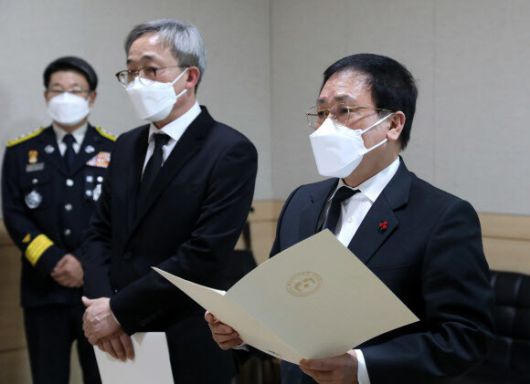 유영민 대통령비서실장이 7일 오전 경기도 평택시 제일장례식장에 마련된 평택 신축 공사장 화재 현장에서 순직한 이형석 소방경 빈소를 찾아 문재인 대통령 조전을 대독하고 있다. 연합뉴스 |