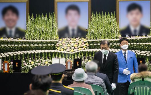 [헤럴드경제] 문재인 대통령이 8일 평택 공사장 화재로 순직한 소방관 3명의 합동영결식에 참석해 고인들의 떠나는 길을 지켰다.