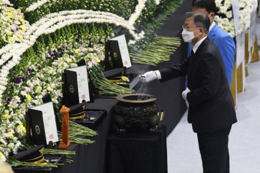 이날 오전 영결식이 열린 평택 이충문화체육센터를 찾은 문 대통령은 순직 소방관들의 넋을 기렸다. 언론에 미리 공지되지 않은 일정이었다. 갑작스러운 참석 결정 탓에 대통령의 조사(弔辭)도, 별도의 소개도 없었다. 문 대통령은 행사 때마다 앉는 가장 첫줄 가운데가 아니라 뒷줄에 앉았다.