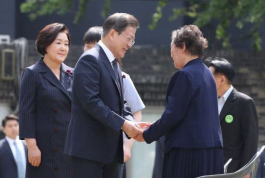 지난 2020년 6월 10일 서울 용산구 민주인권기념관에서 열린 6·10 민주항쟁 기념식에서 문재인 대통령이 배은심 여사와 인사하는 모습. (사진=연합뉴스) |