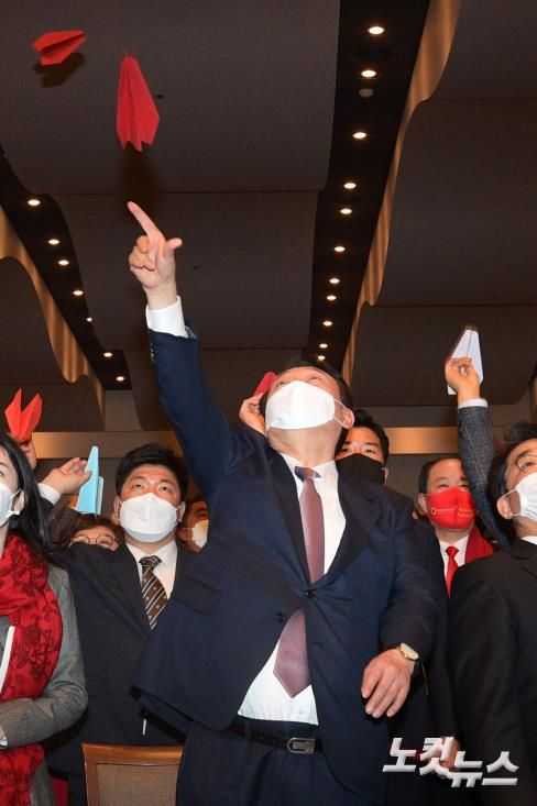 윤석열 국민의힘 대선 후보가 10일 오전 인천 연수구 송도센트럴파크 호텔에서 열린 인천시 선거대책위원회 출범식에서 대선 승리를 기원하며 종이비행기 날리기 퍼포먼스를 하고 있다.