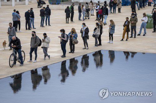 코로나19 환자 폭증세 속에 검사를 받기 위해 줄을 선 텔아비브 시민들. |