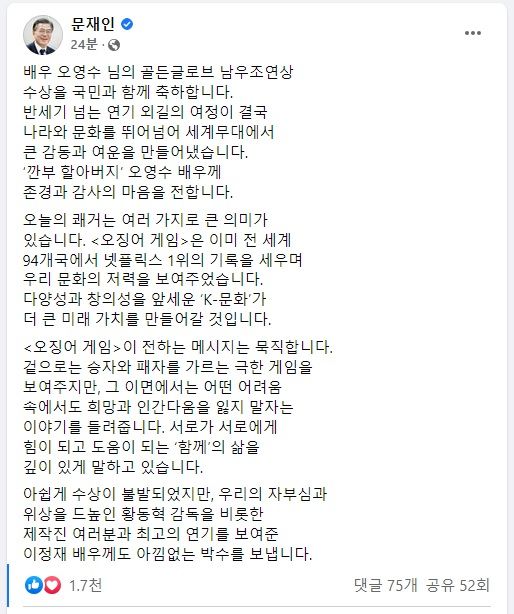 문 대통령은 "배우 오영수 님의 반세기 넘는 연기 외길 여정이 결국 나라와 문화를 뛰어넘어 세계무대에서 큰 감동과 여운을 만들어냈다"고 평가했다.