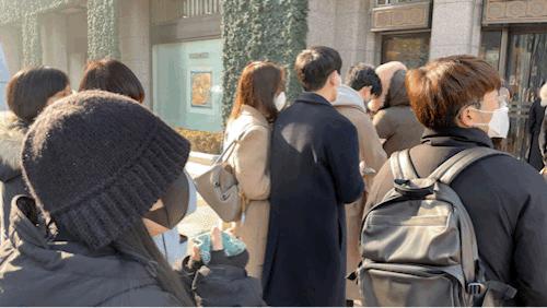 일반 출입문에는 샤넬, 롤렉스 대기 예약 줄에 비해 인기가 적었지만 개점 5분 전, 40여명의 고객들이 백화점에 들어가기 위해 줄지어 섰다.