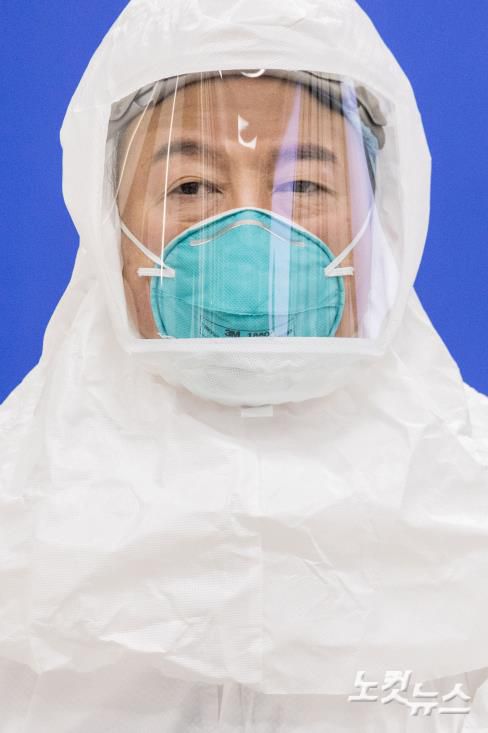 윤석열 국민의힘 대선 후보가 11일 오후 서울 중구 대한간호협회를 방문해 코로나위기대응 간호사 간담회에서 레벨D방호복을 입고 있다.저작권자 © CBS 노컷뉴스 무단전재 및 재배포 금지