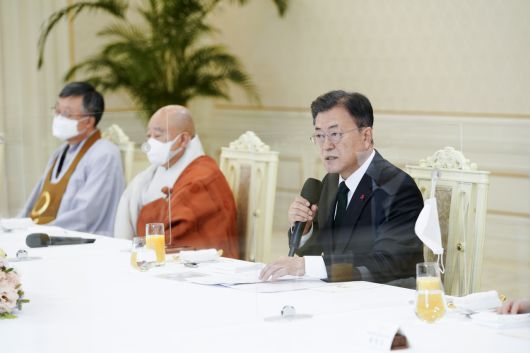 이와함께 문 대통령은 "코로나 극복을 위해 오랜 기간 고통을 나누며 함께 노력해주신 것에 감사드린다"며 "각 종단마다 그동안 정부의 방역조치에 적극 협조하며 법회, 예배, 이사 같은 신앙 활동을 자제 해주셨고 심지어 부처님오신날 경축법회, 연등회 같은 가장 중요한 행사까지 방역을 위해 연기하거나 취소하거나 솔선수범 보여주셨다. 그 같은 협조 덕분에 이번 4차 유행에서는 종교시설 관련 감염이 크게 줄어들었다"고 말했다.
