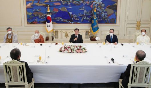 문 대통령은 이날 오전 청와대 본관에서 '종교 지도자 초청 오찬 간담회'를 열고 "오랜만에 7대 종단 지도자님들을 한자리에 모셨다. 코로나 극복을 위해 오랜 기간 고통을 나누면서 함께 노력해 주신 것에 감사드린다"며 이같이 말했다.