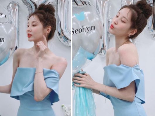 사진 속 서현은 잔머리를 내린 올림머리와 핑크 립 메이크업을 연출하고 포즈를 취하고 있다. 그는 가슴선이 드러나는 하늘색 오프숄더 드레스를 입고 화사한 룩을 선보였다.