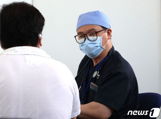일본의 한 남성이 신종 코로나바이러스 감염증(코로나19) 백신을 접종하기 전 의사의 진료를 받고 있다. © AFP=뉴스1 |