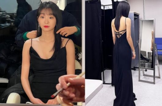 사진 속 김다미는 대기실에서 헤어 메이크업을 받고 있다. 바닥까지 내려오는 미니 블랙 드레스를 입은 모습이 눈길을 끈다. 특히 등을 과감하게 노출, 단아한 얼굴과 180도 다른 분위기로 시선을 사로잡았다.