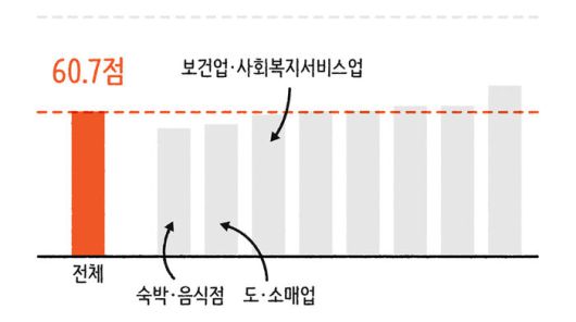 가장 웹 접근성이 잘 갖춰진 업종은 금융 및 보험업이었어요. 71.5점으로 평균보다 10점이 넘는 점수를 받았죠. 2019년의 점수 60.7점과 비교해도 10점 넘게 상승한 겁니다. 반면 숙박 및 음식점업은 53.6점으로 가장 낮은 점수를 받았어요. 쇼핑 사이트를 포함한 도매 및 소매업도 55.3점으로 뒤에서 2등을 했죠. 두 업종은 나란히 2019년 대비 점수가 하락하기도 했어요. 평가 항목 중에서는 대체 텍스트 제공 항목 준수율이 24.1%로 가장 낮았습니다.