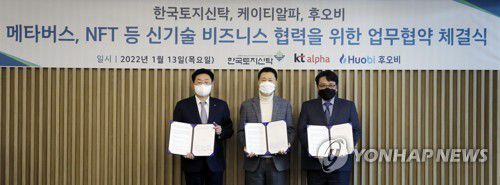 (서울=연합뉴스) 조성흠 기자 = KT[030200]의 유통 자회사 KT알파는 메타버스 기반의 암호화폐 및 디지털 자산 거래 등 미래 사업을 위해 부동산금융회사 한국토지신탁[034830], 가상자산사업자 후오비코리아와 협력한다고 14일 밝혔다.