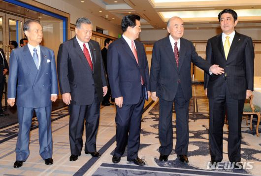 [도쿄(일본)=AP/뉴시스]지난 2008년 5월 8일 후진타오 전 중국 국가주석(가운데)이 도쿄를 방문해 일본의 전 총리들과 조찬 회동에 앞서 이야기를 나누고 있다. 가장 왼쪽의 푸른색 정장을 입은 사람이 가이후 도시키 전 총리, 가장 오른쪽의 노란색 넥타이를 착용한 사람이 아베 신조 전 총리다. 가이후 전 총리는 지난 9일 사망한 사실이 알려졌다. 향년 91세. 2022.01.14. |