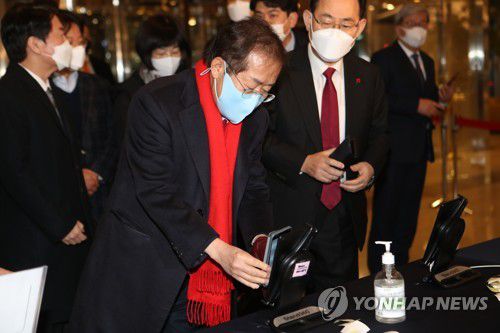 QR코드 찍는 홍준표 |