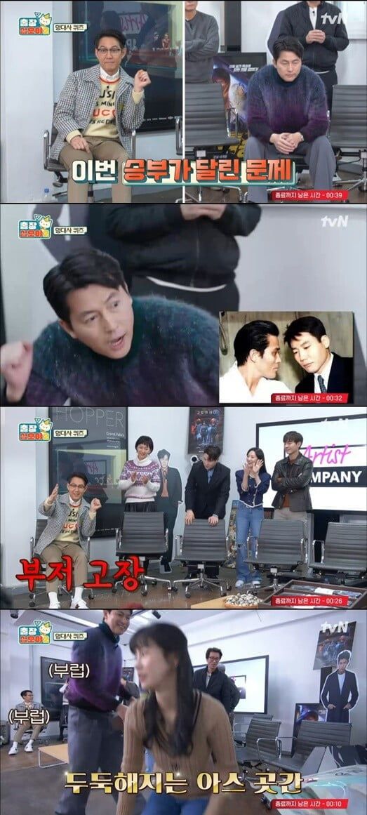 이에 이정재는 얼떨떨해하며 "이거 내가 나온 드라마인데"라며 쓴 입맛을 다셨다. 정우성은 "이거 문제를 너무 편파적으로 낸 거 아니야?"라며 이의를 재기하면서도 상품을 쓸어담으며 만족스러운 표정을 지었다.