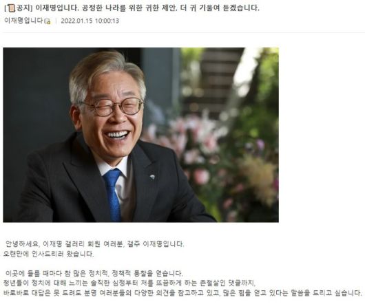 이재명 더불어민주당 대선후보가 15일 인터넷 커뮤니티 '디시인사이드' 이재명 갤러리에 올린 글. (사진=이재명 갤러리 캡처) 2022.1.15 *재판매 및 DB 금지 |
