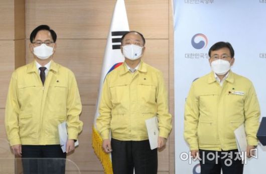 홍남기 경제부총리 겸 기획재정부 장관(가운데), 권덕철 보건복지부 장관(오른쪽)이 14일 서울 종로구 정부서울청사에서 열린 방역조치 연장 및 소상공인 지원 관련 정부합동 브리핑을 기다리고 있다./김현민 기자 kimhyun81@ |