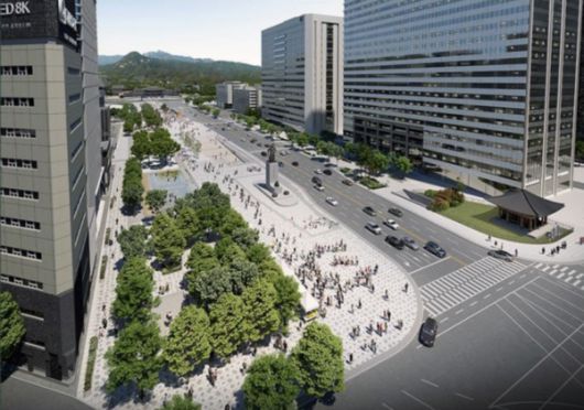 새 광화문광장 조성사업을 통해 왕복 12차 도로는 7차선으로 절반가량 줄어들며, 그만큼 보행자 도로가 조성되어 녹지와 쉼터가 함께 있는 공원 같은 광장이 다가오는 4월 개장할 예정이다.