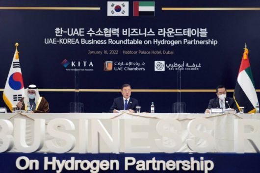 이어 "한국의 대표적인 대기업 10곳이 수소동맹을 출범하는 등 기업들도 수소 분야에 과감하게 투자하고 있다"며 "그린 수소와 블루 수소의 생산에 강점을 가진 UAE와 수소차와 충전소, 연료전지, 액화운송 등 수소의 활용과 저장, 유통에 강점을 가진 한국이 서로 협력하면 양국은 수소경제를 선도하게 될 것"이라고 덧붙였다.