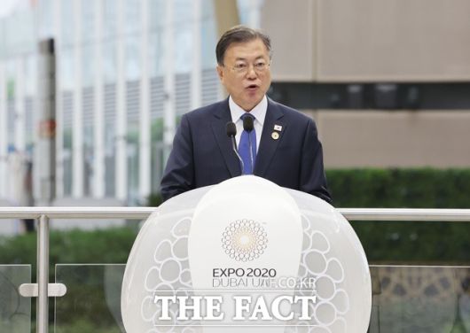 [더팩트ㅣ허주열 기자] 아랍에미리트(UAE)를 방문 중인 문재인 대통령은 16일 오후(현지시간) UAE 두바이엑스포장에서 열린 '한국의 날' 행사에 참석해 한국과 UAE 간의 '특별 전략적 동반자 관계'를 공고히 하고, '2030 부산 엑스포' 유치에 대한 강한 의지를 밝혔다.