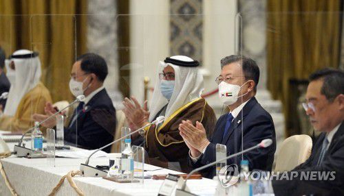 문 대통령은 특히 "지금까지 2천여명의 장병이 근무한 아크부대가 파병 10주년 맞았다"며 "양국은 형제와 같은 우의를 바탕으로 국방 방산 협력을 비약적으로 확대했다"고 거듭 강조했다.