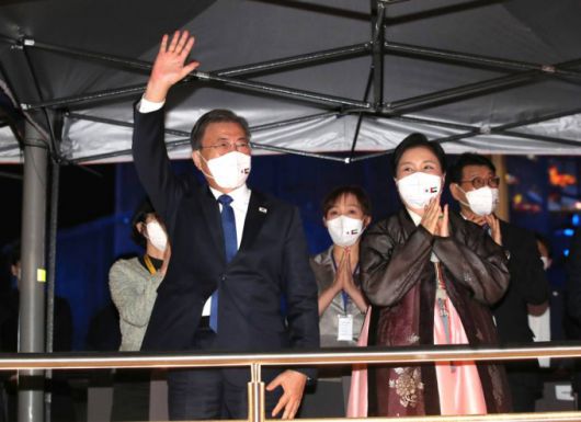 [두바이=뉴시스] 김진아 기자 = 문재인 대통령과 김정숙 여사가 16일(현지시간) 아랍에미리트 두바이 엑스포 쥬빌리공원에서 열린 K-POP 콘서트를 관람 중 손을 들어 인사하고 있다. 2022.01.17. |