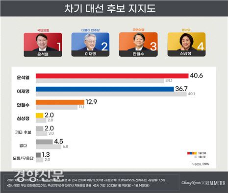 리얼미터가 오마이뉴스 의뢰로 지난 9~14일 전국 18세 이상 3031명을 대상으로 차기 대선 후보 지지도를 물은 결과, 윤 후보 지지율은 한 주 전 같은 조사보다 6.5%포인트 오른 40.6%였다. 이 후보는 3.4%포인트 빠진 36.7%였다.