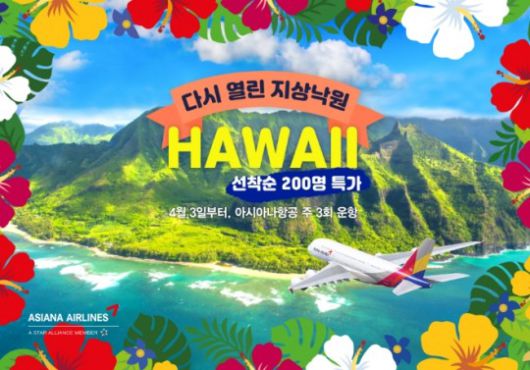 하와이는 관광, 쇼핑, 휴양 등을 모두 즐길 수 있는 인기 여행지로, 세계적으로 여행객들이 가장 많이 찾는 지상 최고의 낙원이다. 아시아나항공은 시장동향을 주시하며 7월부터는 매일 1회로 증편 운항도 검토한다는 방침이다.