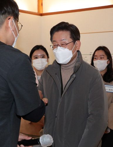 더불어민주당 이재명 대선후보가 17일 오전 서울 강서구 이화여대 서울병원 보구녀관에서 열린 청년 간호사 간담회에서 참석자들과 인사하고 있다. <사진공동취재단/장승윤> |