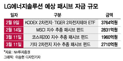 구체적으로△ 2월 9일 KODEX 2차전지·TIGER 2차전지테마 ETF(3764억원) △2월 14일 MSCI 지수 추종 패시브 펀드(2831억원) △3월 11일 코스피200 지수 추종 패시브 펀드(1960억원) △3월 11일 기타 2차전지 지수 추종 패시브 펀드(2710억원) 등 약 1조원 수준이다.