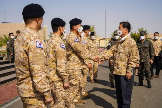 문재인 대통령을 수행해 아랍에미리트(UAE)를 방문중인 정의용 외교부 장관이 17일(현지시간) 문 대통령을 대신해 안보국방전략비서관(중장 강신철), 합동참모본부 민군작전부장(소장 정덕성) 등과 UAE에 주둔한 아크부대를 찾아 장병들을 격려했다.