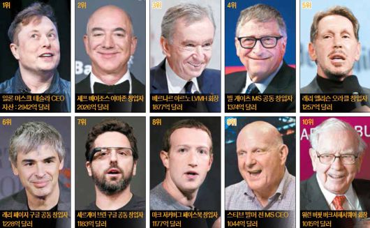 세계 부자 10인은 지난해 포브스가 선정한 억만장자 순위에 오른 인물들이다. 세계 최고 부자로 꼽힌 일론 머스크 테슬라 최고경영자(CEO)의 순자산은 2942억 달러(약 350조원)로 집계됐다. 코로나19 대유행 이전보다 10배 늘었다. 제프 베이조스 아마존 창업자가 2026억 달러(약 241조원)로 2위, 베르나르 아르노 루이뷔통모에헤네시(LVMH) 회장 일가가 1877억 달러(약 223조원)를 보유해 3위에 올랐다.