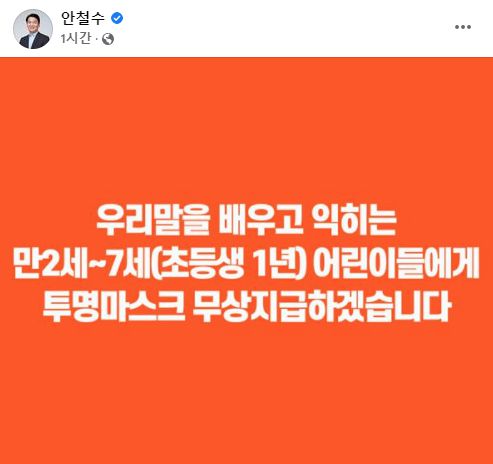 안 후보는 이날 페이스북을 통해 "우리말을 배우고 익히는 만 2~7세(초등생 1년) 어린이들에게 투명마스크를 무상 지급하겠다"라고 공약했다.