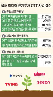 문체부는 올해 OTT 특화콘텐츠 제작지원 116억원, OTT 등 콘텐츠 재제작지원 22억원, 드라마펀드 400억원, OTT 콘텐츠 특성화 대학원 지원사업 10억원 등 예산 546억원을 투입한다.