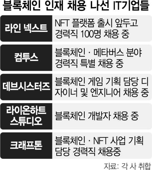 게임 업계도 블록체인 인력 확보를 위한 채용 활동에 적극적이다. 자체 블록체인 플랫폼 ‘C2X’를 구축 중인 컴투스(078340) 그룹은 최근 블록체인과 메타버스 분야의 경력직 특별 채용에 나섰다. 이달 31일까지 모집을 진행하며 게임금융 설계와 플랫폼·서비스 개발, 가상자산 사업 등 8개 직군에서 뽑는다. 컴투스는 경력에 따라 업계 최고 수준의 연봉과 입사 동시에 일주일 휴가도 내걸었다. 컴투스 그룹은 ‘서머너즈 워: 크로니클’, ‘월드오브제노니아’ 등 C2X 기반에서 운영되는 P2E 신작 게임들을 준비 중에 있다. 또 게임, 콘텐츠, 블록체인, 메타버스를 포괄하는 미러월드(쌍둥이 가상세계) 플랫폼 ‘컴투버스’도 선보일 예정이다.
