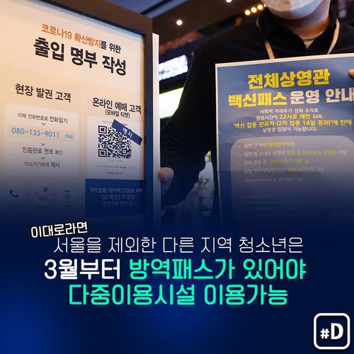 이대로라면 3월부터 서울 청소년은 방역패스 없이 모든 다중이용시설을 이용할 수 있는 반면 그 외 지역 청소년은 학원, 독서실·스터디카페 외엔 방역패스가 있어야 합니다.