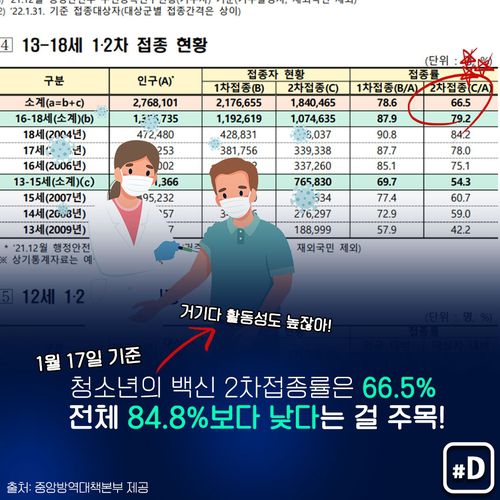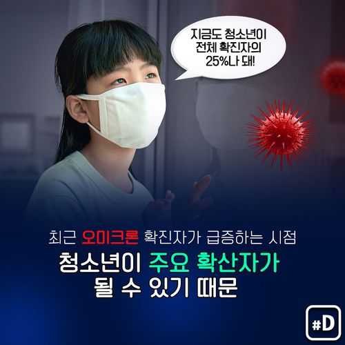 이와 관련, 정부는 "청소년 확진자가 전체 확진자 중 25% 이상을 유지하고 있다"면서 이달 17일 기준으로 13∼18세 청소년 2차 접종률이 66.5%로 다른 연령대에 비해 크게 낮다는 점을 듭니다.
