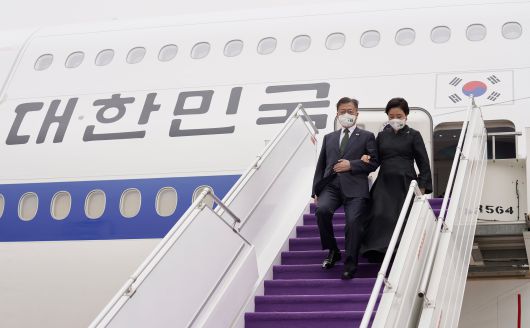 중동 3개국을 순방 중인 문재인 대통령과 김정숙 여사가 18일(현지시간) 사우디아라비아 리야드 킹칼리드 국제공항 왕실터미널에 도착, 공군 1호기에서 내리고 있다. /연합뉴스 |