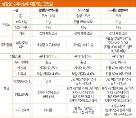 생활숙박시설은 호텔 같은 숙박시설에 취사나 세탁시설 등 주거 기능을 갖춘 것이 특징이다. 생활숙박시설은 분양받은 사람의 선택에 따라 주거용 오피스텔처럼 장기 임대 계약을 맺어 월세를 받거나 호텔·콘도처럼 숙박시설로 운용해 수익을 낼 수 있다는 점에서 일부 투자자로부터 관심을 받았다.