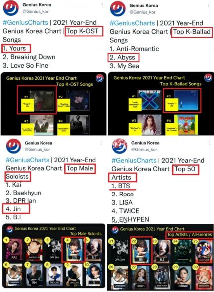 진의 'Yours'는 '2021년 연말 지니어스 코리아 차트'에서 '한국 OST 톱 송'(Top K-OST Songs) 1위를 차지하는 눈부신 성과와 '한국 발라드 톱 송'(Top K-Ballad Songs)에서는 진의 자작 솔로곡 '어비스'(Abyss)가 2위를 기록했다.