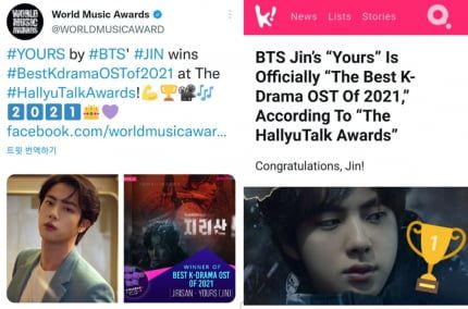 지난 16일 '월드 뮤직 어워드'(World Music Award)는 공식 트위터 계정을 통해 '진의 'Yours'가 '한류톡 어워즈'에서 베스트 K-드라마 OST상을 수상했다'고 축하를 전했다.