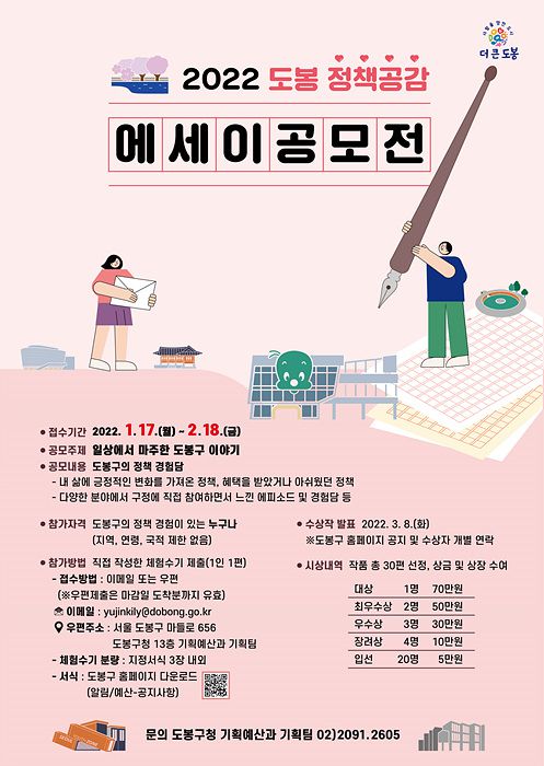 도봉구(구청장 이동진)가 주민의 관점에서 가치있는 정책을 찾고, 정책 경험담을 기록·공유하기 위한 ‘도봉 정책공감 에세이 공모전’을 실시한다.